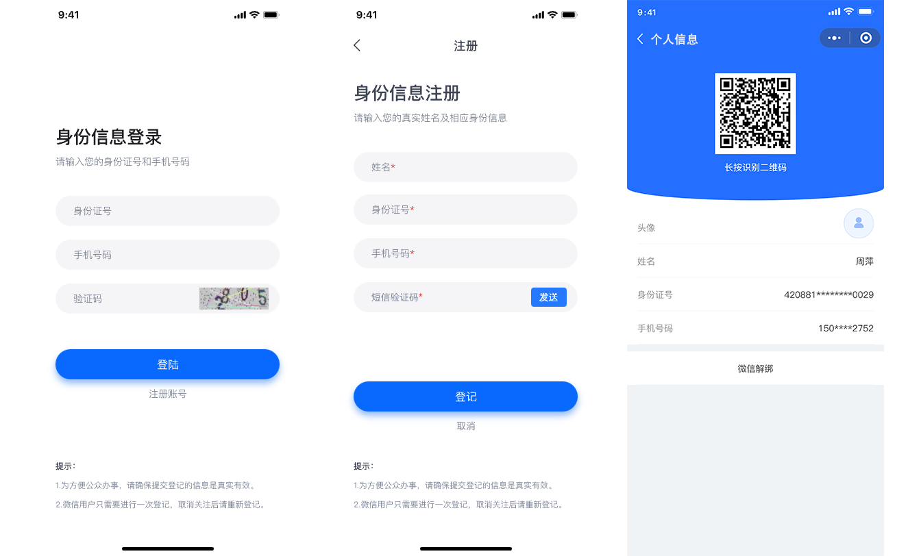 通过个人信息、手机号码、短信验证相结合方式进行登记注册服务,完成登记后即可通过手机及验证短信进行登录,登录后即可查询到个人的相关信息。支持通过微信快捷方式进行授权快捷注册登记。