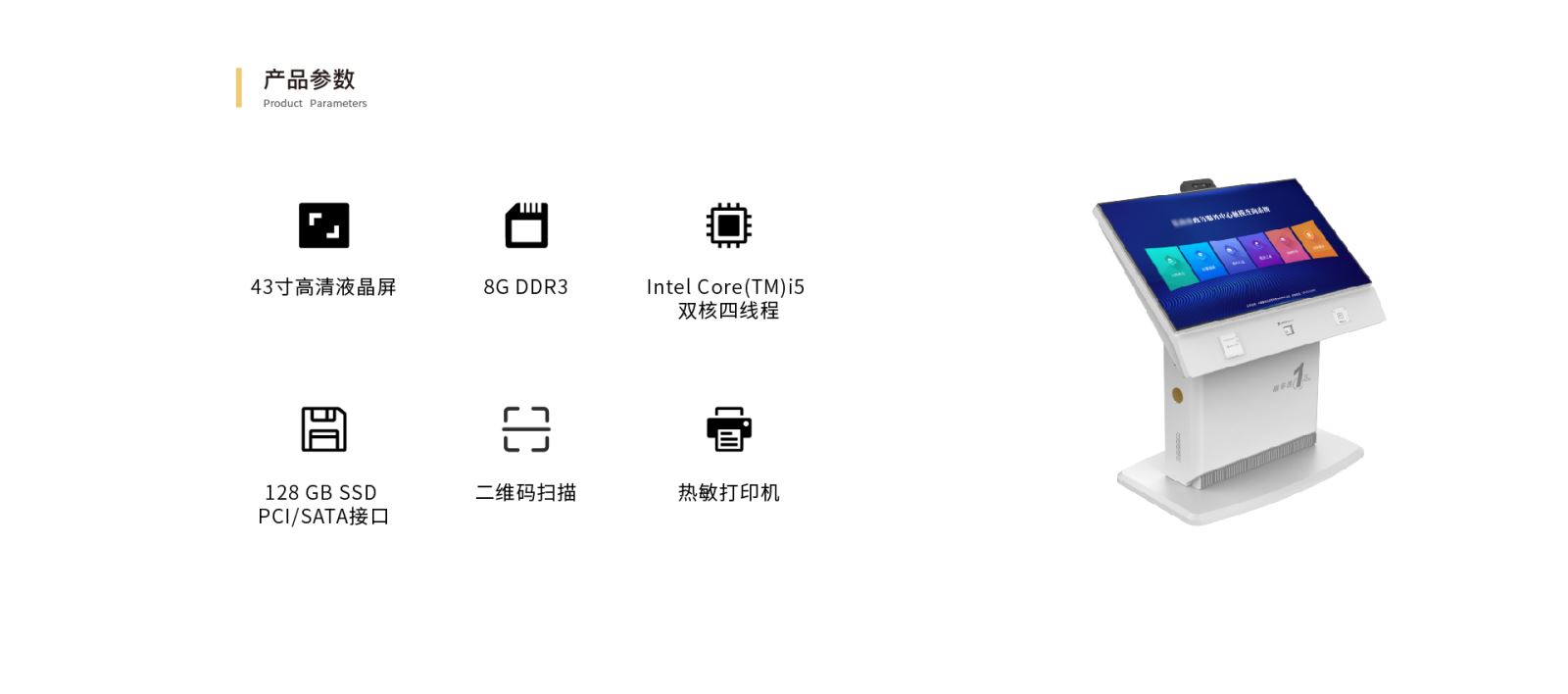 业务受理终端: 43寸高清液晶屏,分辨率 1920*1080   亮度 400cd/m2   对比度    2000:1 显示面积 941*530mm      FULL VIEW全视角