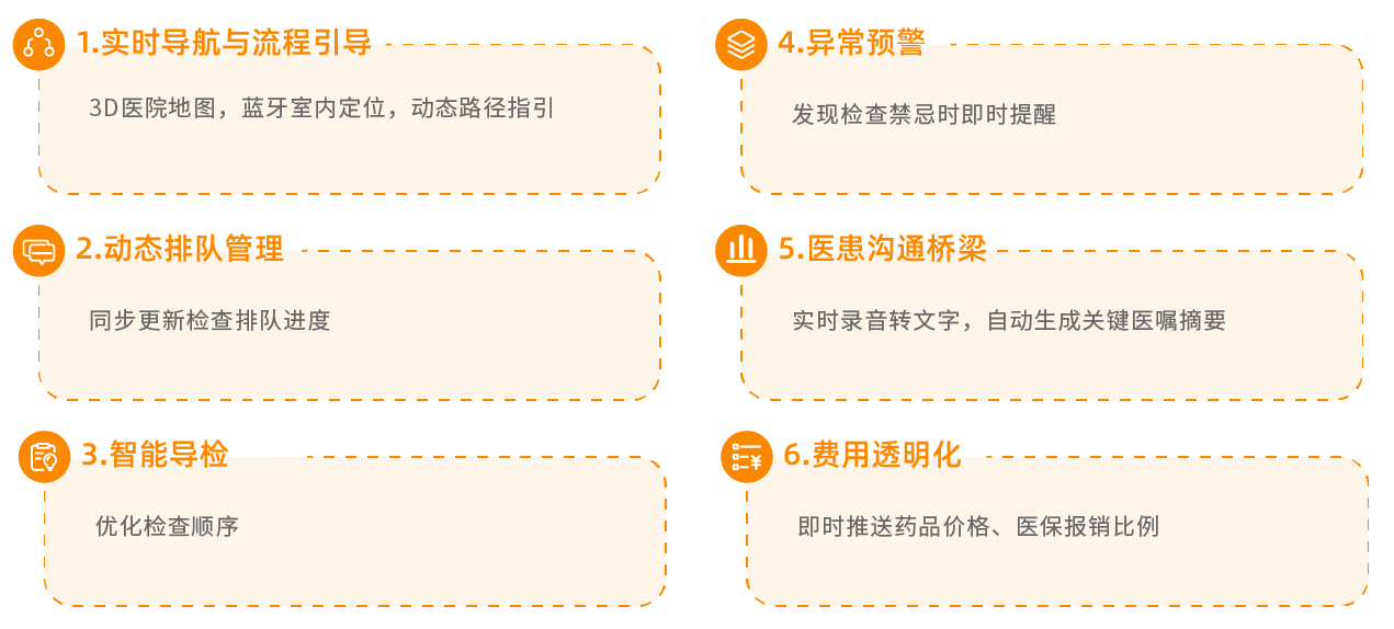 AI 通过症状分析推荐最优科室,AI预问诊分流,缩短医生面诊时间,AR 实景指引+实时排队提醒,减少无效走动